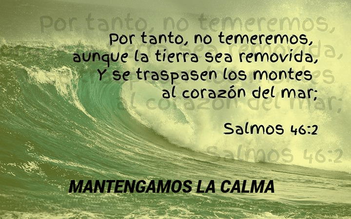 «Dios es nuestro amparo y fortaleza, nuestro pronto auxilio en las tribulaciones. Por tanto, no temeremos, aunque la tierra sea removida, y se traspasen los montes al corazón del mar; aunque bramen y se turben sus aguas, y tiemblen los montes a causa de su braveza.» (Salmos 46:1-3)